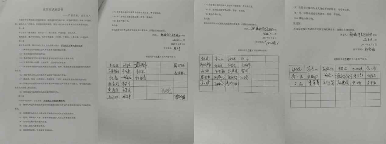 知行书院、新媒体艺术与设计学院1626大班、空间环境学院全体本科生自愿签署了《诚信应试承诺书》,承诺考试期间遵守考试纪律,杜绝考试作弊行为,带头营造诚信、公平、公正的考试环境、带头营造积极奋进的学习风气。