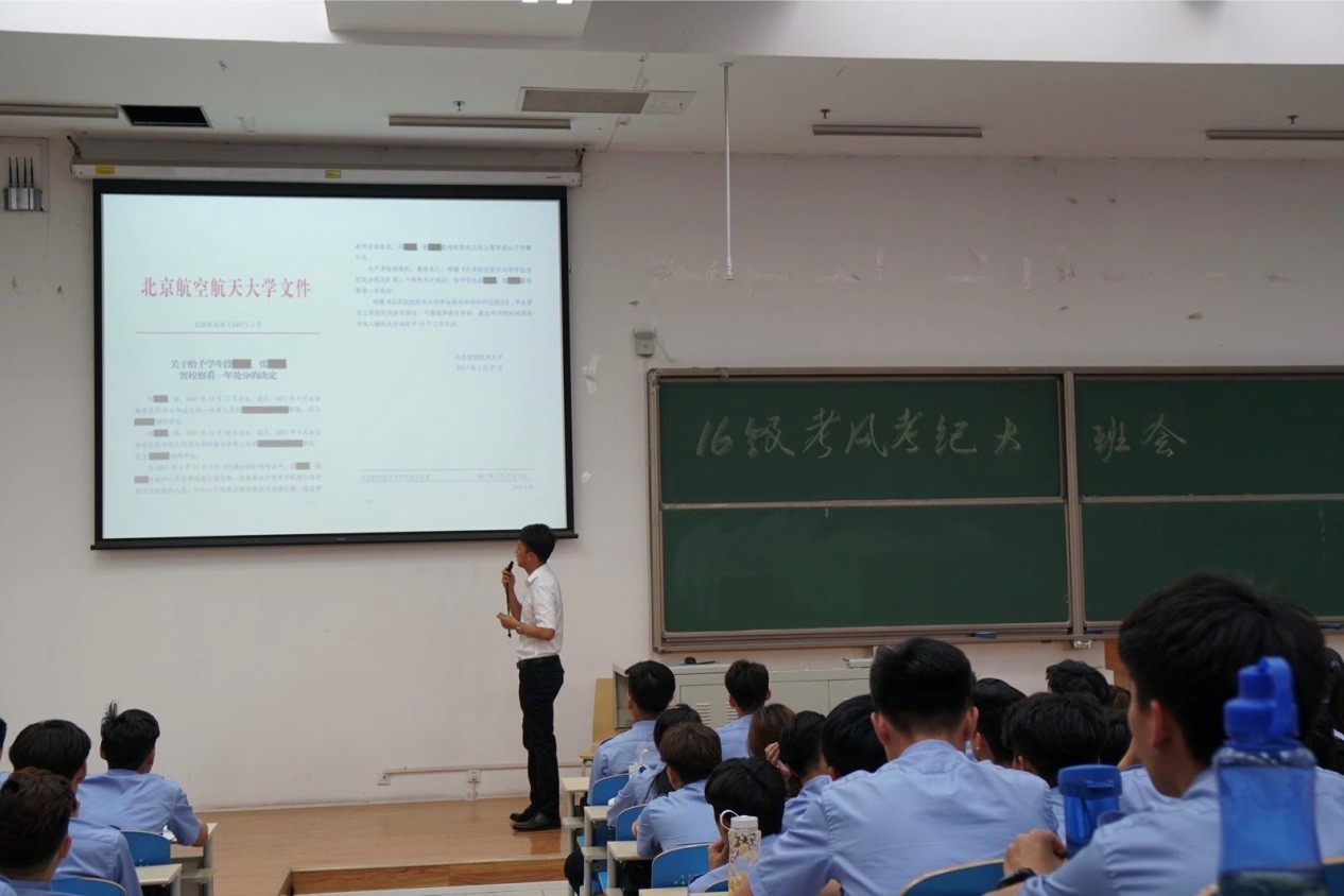 高等理工学院1623大班、中法工程师学院1524大班、化学学院1527和1627大班、飞行学院1616大班、空间与环境学院1630大班的辅导员,结合学生工作部下发的经典案例,从大学考试目的、作弊心理、作弊危害等方面进行深入分析讲解,为学生上了一堂生动的失信作弊行为警示教育课。